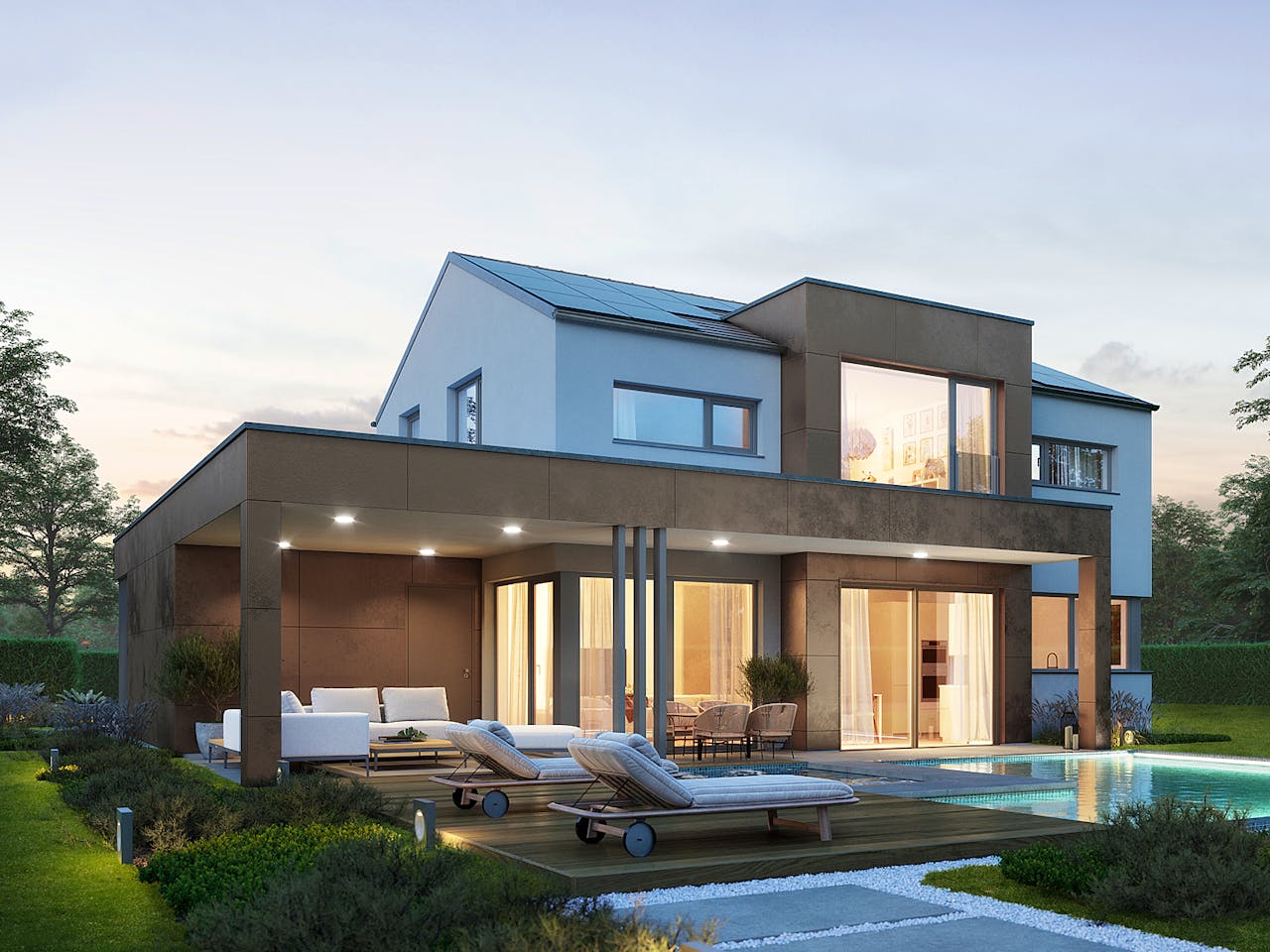 Besondere Merkmale sind die zeitlose Formensprache, klare Grundrisse, großzügige Glasfronten sowie die gelungene Verbindung von Privatsphäre und Offenheit. So entsteht ein modernes Zuhause, das Charakter, Komfort und Effizienz vereint.