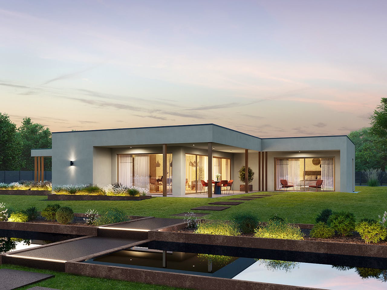 Der Bungalow C138 begeistert durch klare Linien, großzügige Fensterfronten und eine offene, lichtdurchflutete Raumgestaltung. Die Verbindung aus moderner Architektur und funktionaler Planung schafft ein Wohnkonzept, das höchsten Ansprüchen gerecht wird. Der L-förmige Grundriss öffnet sich zu einem geschützten Außenbereich und lässt Innen- und Außenraum harmonisch miteinander verschmelzen. Der weitläufige Wohn-, Ess- und Küchenbereich mit großen Schiebetüren bildet das Herzstück des Hauses – perfekt für entspannte Familienzeit oder gesellige Abende mit Freunden.