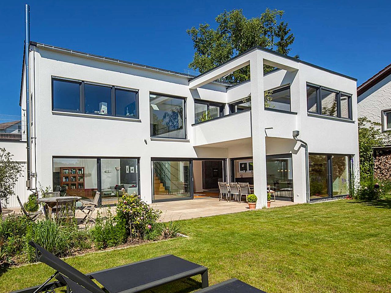 Im Hausinneren wird das zeitgemäße Stilkonzept fortgeschrieben. Ein durchdachtes Raumkonzept mit großen, symmetrisch angeordneten Glasflächen lässt die Grenze zwischen Innen- und Außenraum verschwimmen und bringt viel Licht ins Haus. Abgerundet wird der exklusive Wohntraum durch eine Galerie mit filigranem Metallgeländer und einem bis in den First offenen Aufenthaltsbereich.