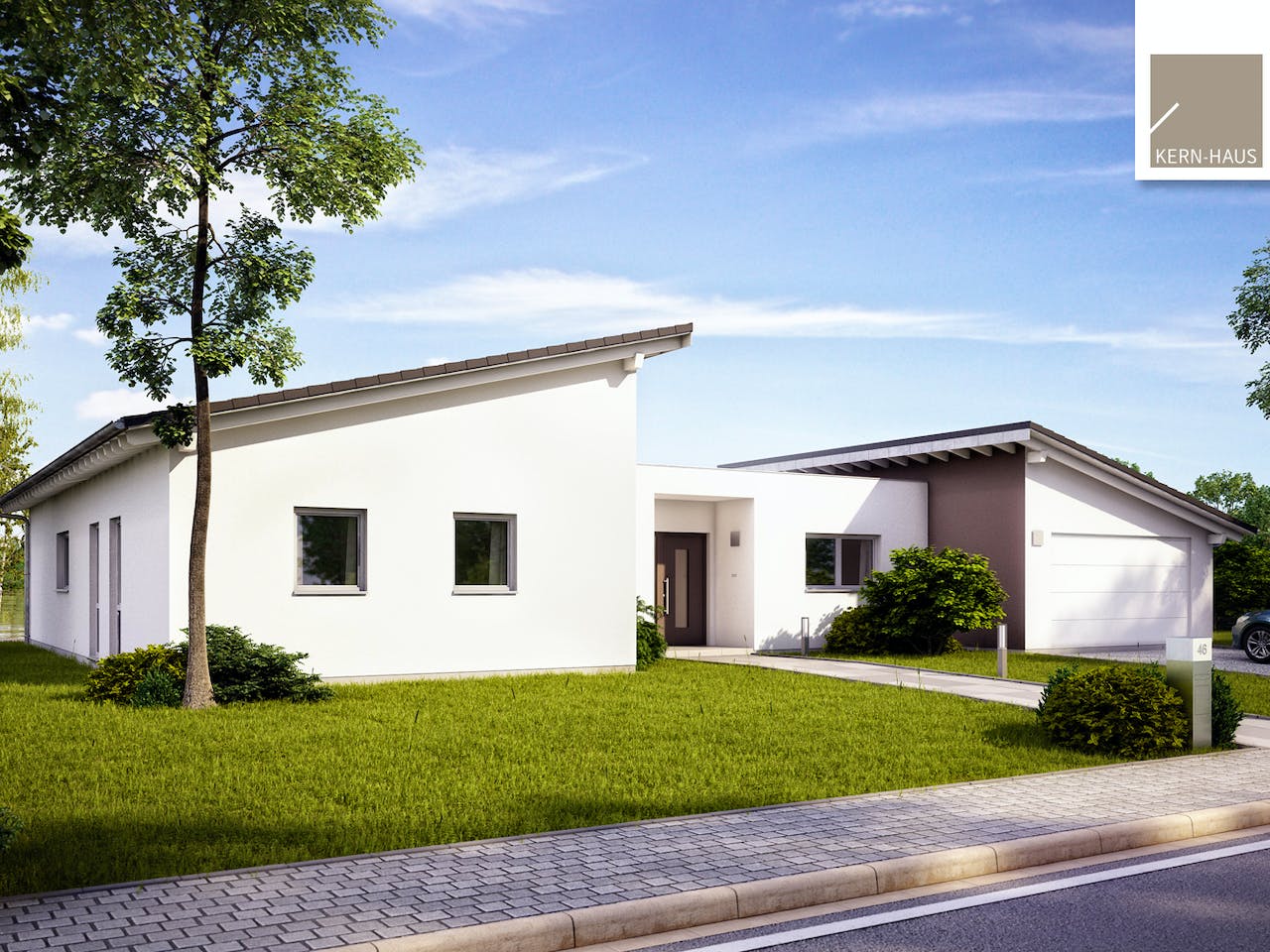Exklusive Optik bietet der Familienbungalow Trio von Kern-Haus. Die moderne Dachgestaltung, kombiniert mit den großen Fensterflächen sorgen für lichtdurchflutete Wohnräume und ein besonderes Ambiente.