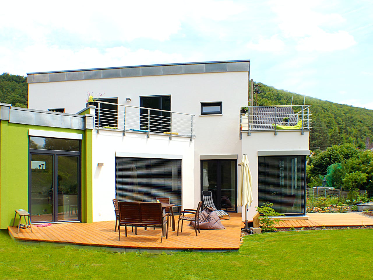 Sparsamer Kubus für die ganze Familie mit vielen Extras 150 Quadratmeter Wohnfläche, eine Fußbodenheizung - gespeist von einer Erdwärmepumpe, eine Photovoltaikanlage zur Stromerzeugung für den Eigenbedarf, ein Kamin für die Gemütlichkeit mit Holzaufzug, ein bequemer Wäscheabwurf zum Keller, 2 Balkone und eine großzügige Terrasse aus Holz zum geräumigen Garten hin: Lehner Haus baut energieeffiziente sparsame Häuser, die alles für ein angenehmes Wohnen bieten.