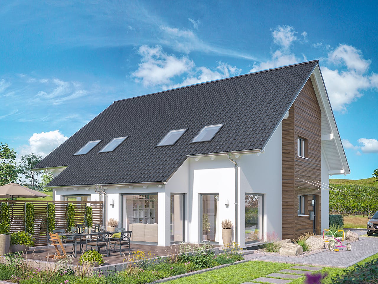 Das Solution 125 L V2 ist ein Doppelhaus mit klassischem Satteldach. Die Dachabschleppung zieht sich bis auf den Wintergartenerker im Erdgeschoss und komplementiert damit perfekt die Fassade des Hauses. Dieser und der zweigeschossige Giebelerker sorgen für ordentlich Platz. Damit vergrößerst du bequem deine Küche und die Kinderzimmer. Das i-Tüpfelchen ist die Glasüberdachung am Hauseingang.