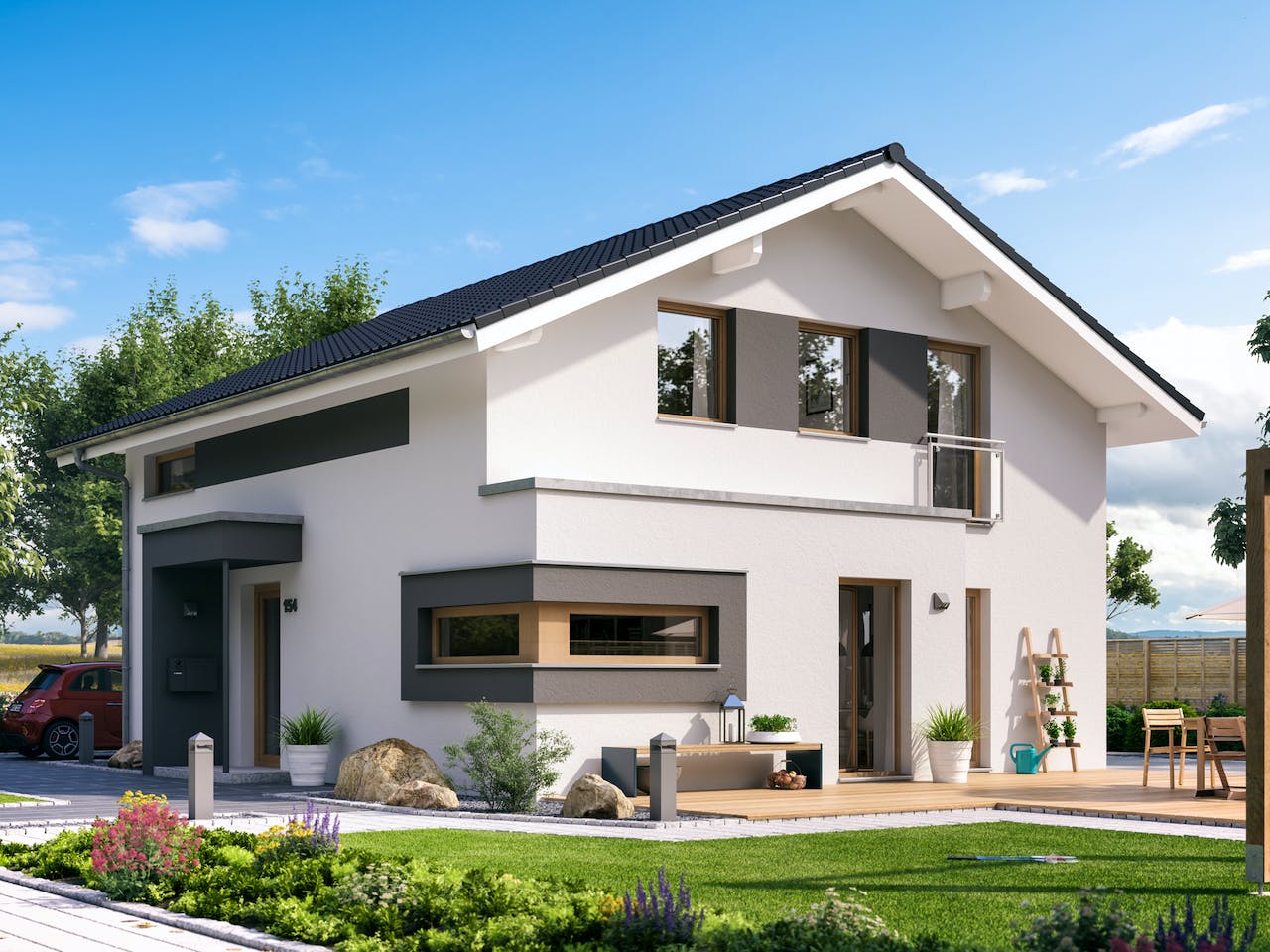 Das SUNSHINE 154 ist so einzigartig und unverwechselbar wie du und deine Familie. Beim Gang durch die Diele mit der schicken, geradläufigen Treppe zieht es deinen Blick direkt hinaus in den Garten. Auf der einen Seite geht es in den großen, offenen Koch- und Essbereich, gegenüber machst du es dir in der Sitzecke gemütlich. Heimkommen, ankommen, abschalten – dafür eignet sich ein einladendes Plätzchen auf der Galerie im Dachgeschoss. Auch die Kinder haben hier oben ihren eigenen Platz zum Spielen, Lernen und Schlafen. Ein Riesenschlafzimmer oder eines mit separater Ankleide? Bei der Planung passt sich das SUNSHINE 154 deinem persönlichen Lifestyle ganz und gar an. Das gilt für die Architektur und für die Gestaltung. Du wirst begeistert sein, wie viele unterschiedliche Gesichter dieser Entwurf zeigen kann.