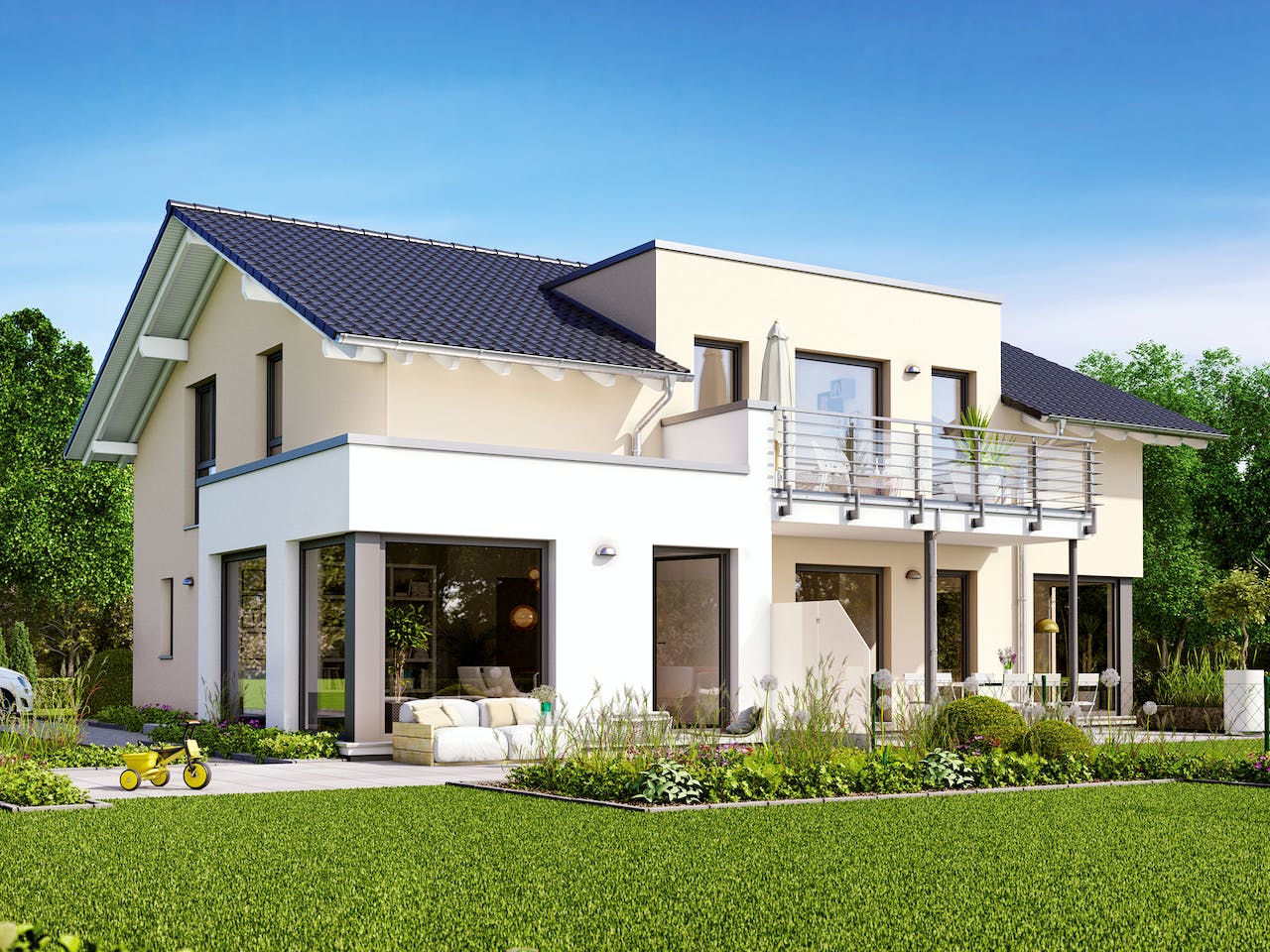 Modernes Mehrgenerationenhaus mit Übereckerker und Zwerchgiebel mit Balkon