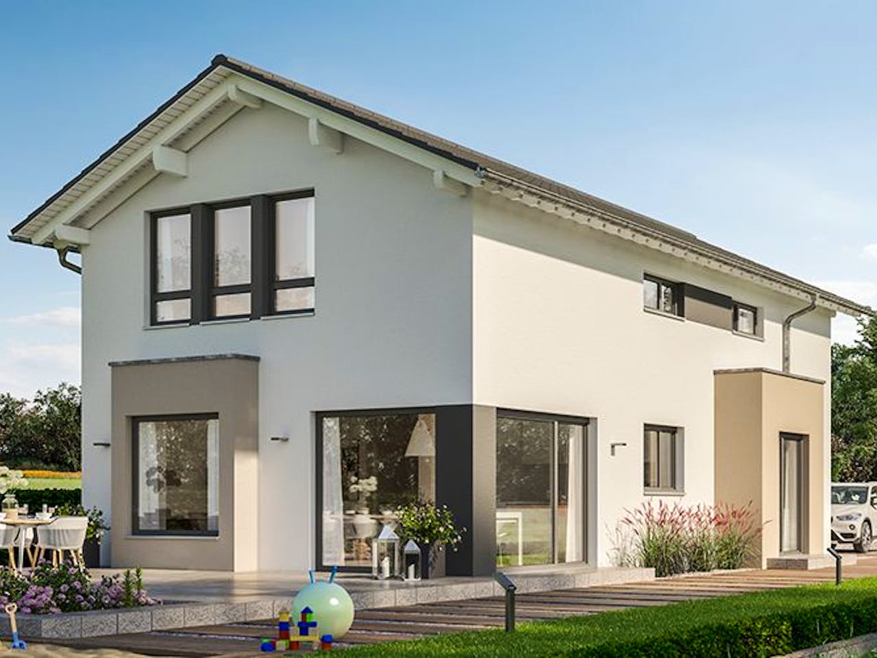 Großes Einfamilienhaus mit schmalem Grundriss und Rechteck-Erker „Chillout”