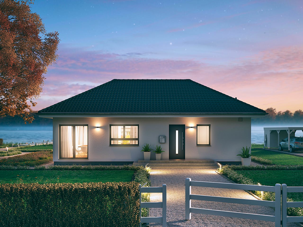 Klare Strukturen mit bodentiefen Fenstern im Bungalow ComfortStyle 10.01 W. Auf 103 m² bietet dieser Bungalow viele Möglichkeiten für die Verwirklichung der kreativen Vorstellungen. Auf fast 50 m² finden Sie einen großzügig gestalteten Wohn- und Essbereich mit angrenzender offener Küche. Die viele bodentiefen Verglasung bringen viel Licht und absolutes Wohlfühlwohnen ins Haus.