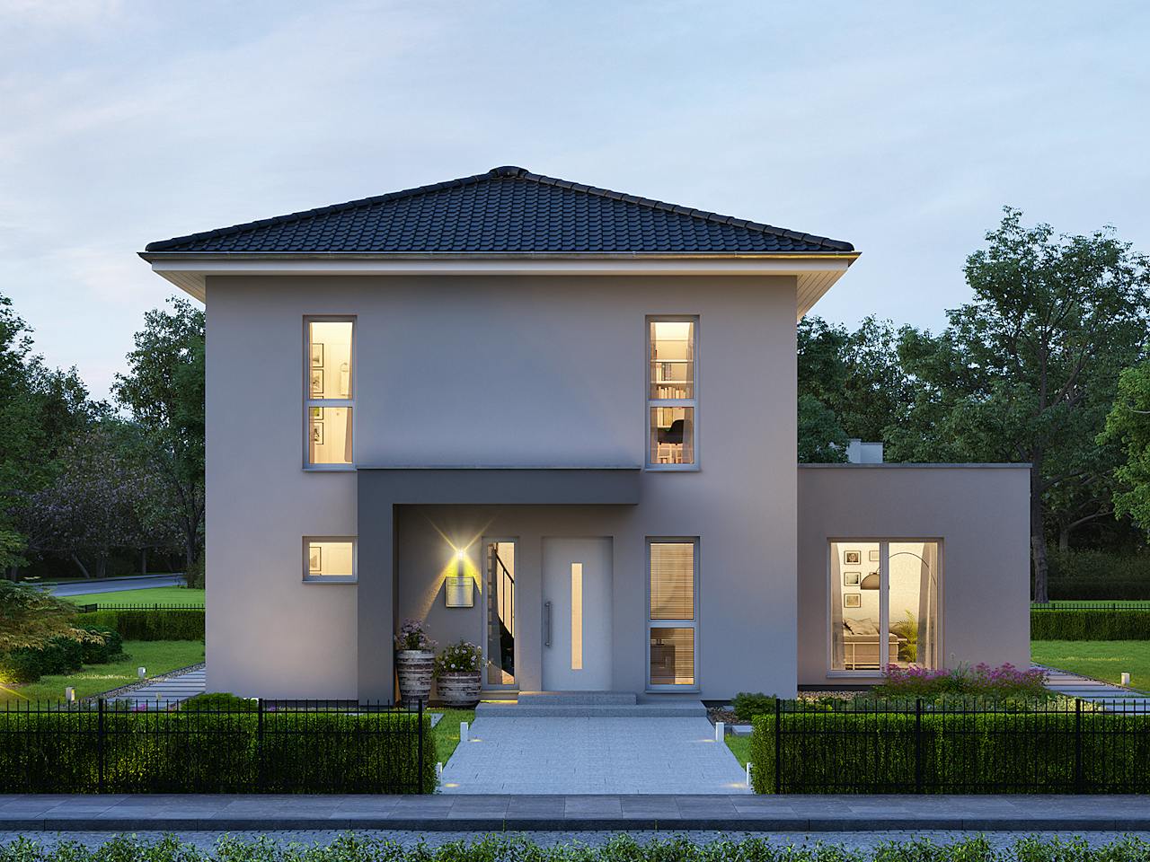Die ungewöhnliche Architektursprache unserer Stadtvilla LifeStyle 15.02 W fällt nicht nur auf, sondern verbindet Form, Funktion und persönliche Wohnvorstellungen zu einer gelungenen Einheit. Eine großzügige Nettogrundfläche von ca. 159 m² teilt sich auf das quadratische Haupthaus mit Walmdach und den versetzt angegliederten Flachdach-Kubus im Erdgeschoss auf.