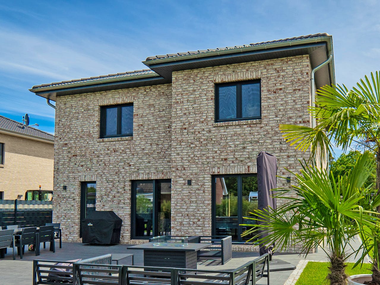 Diese Stadtvilla mit der großen überdachten Terrasse bietet alles um in Urlaubsfeeling zu kommen, mit fast 50 qm lädt der offene Bereich vom Wohnen-Essen und Küche zum Leben und genießen ein, hier kann man die Seele baumeln lassen. Im Dachgeschoss ist reichlich Platz für die Familie