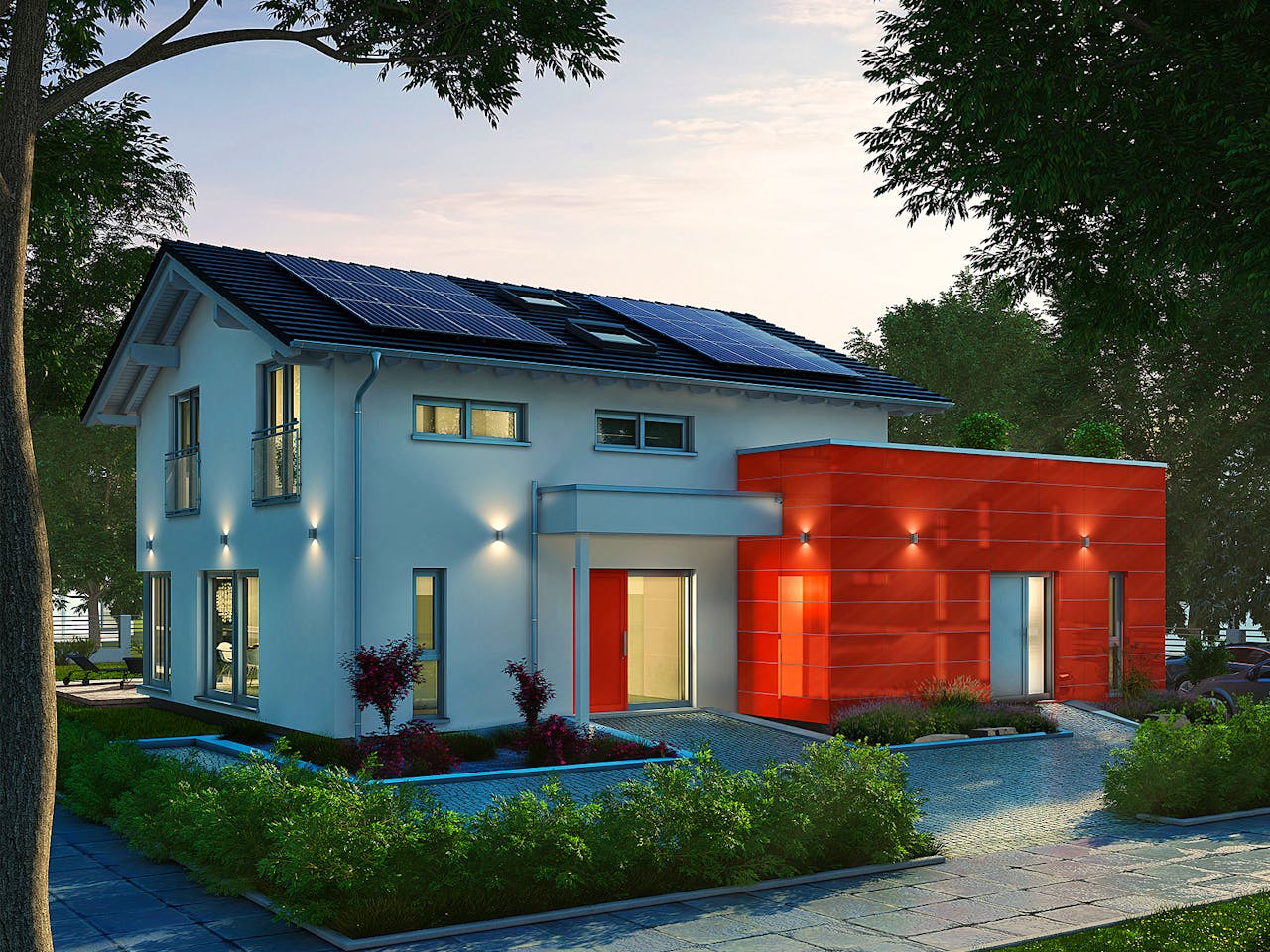 Wer für alle Eventualitäten gewappnet sein will, ist hier gut bedient. Das zweigeschossige Haupthaus wird durch das 43 qm-große Studioapartment räumlich und optisch erweitert: ob Home-Office, Ausweichplatz für heranwachsende Teenager, barrierefreies Wohnen… unser AktivPlus-Haus hat es in sich.