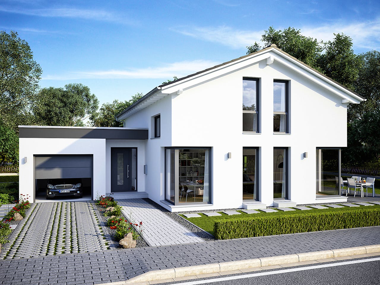 Hinter der klassischen Fassade steckt ein überzeugendes Licht- und Raumkonzept! Übereckverglasungen im Erdgeschoss sowie Kniestock- und Dachflächenfenster im Obergeschoss verleihen dem Satteldachhaus einen optimalen Lichtfluss.