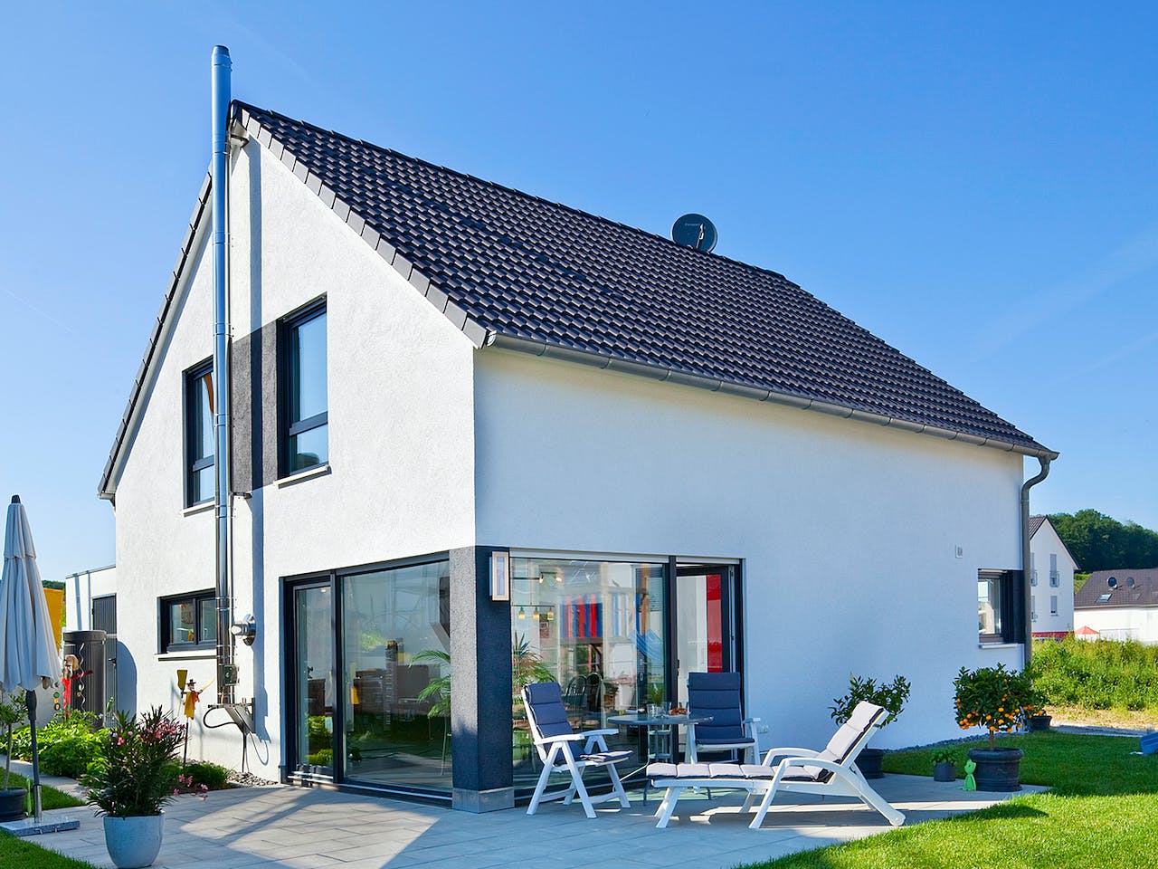 Haus Escher von Baumeister-Haus ist ein kompakter Entwurf in der Bauhaus-Tradition. Planerisch ist bei diesem Haus das Kunststück gelungen, einen geringen Grundstücksbedarf, ein weiträumiges Wohnambiente und einen wirkungsvollen Schutz der Privatsphäre miteinander zu vereinbaren. Dank Technikraum im Erdgeschoss und zusätzlichen Stauräumen verfügt das Haus auch ohne Keller über ausreichend Abstellfläche.