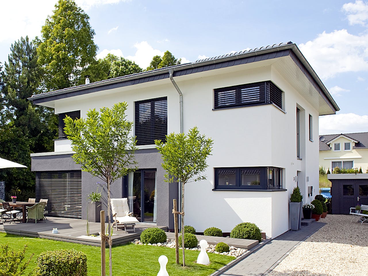 Eine zweigeschossige Villa mit Zeltdach und schmalen Fenstern über Eck sorgt für Aufsehen in der Nachbarschaft. Der elegante Farbwechsel des Anbaus verleiht dem Haus der Freibergers eine ganz besonders schicke und stilvolle Note. Auf sichtbare Sparren- und Pfettenköpfe wurde verzichtet und somit ein noch reduzierteres Äußeres verstärkt. Die Jalousien spenden Schatten und lassen doch Licht ins Haus.