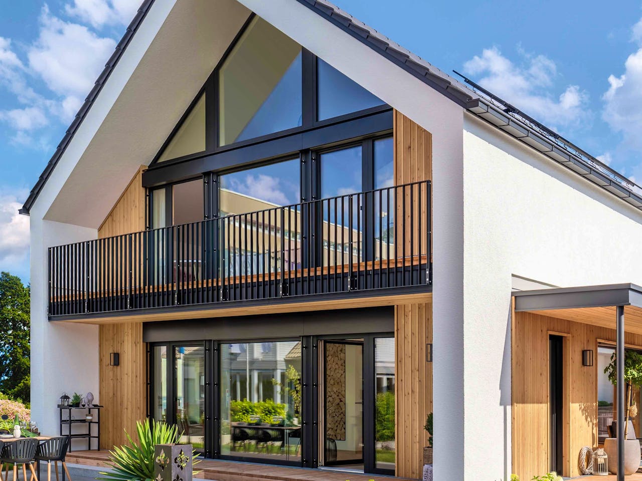 So tritt der geradlinig geschnittene Baukörper souverän auf. In der Grundform eines Hauses mit Satteldach traditionell – in seinem Habitus minimalistisch. In der Optik konsequent reduziert auf die klassischen Materialien Putz, Holz und Glas. Perfektion in der Einfachheit eines kubistischen Architekturstils. Klar, dass dieser Entwurf in seiner großzügigen Geste bewusst verzichtet auf verspielte Kompositionen. Nach außen dominiert die modernschlichte Formensprache, nach innen ein emotionales Wohnerlebnis. Die eingerückte Giebelwand steht für beides: Design und Natur. Schafft geschützte Aufenthaltsbereiche draußen und einen großartigen Blick ins Freie von innen.