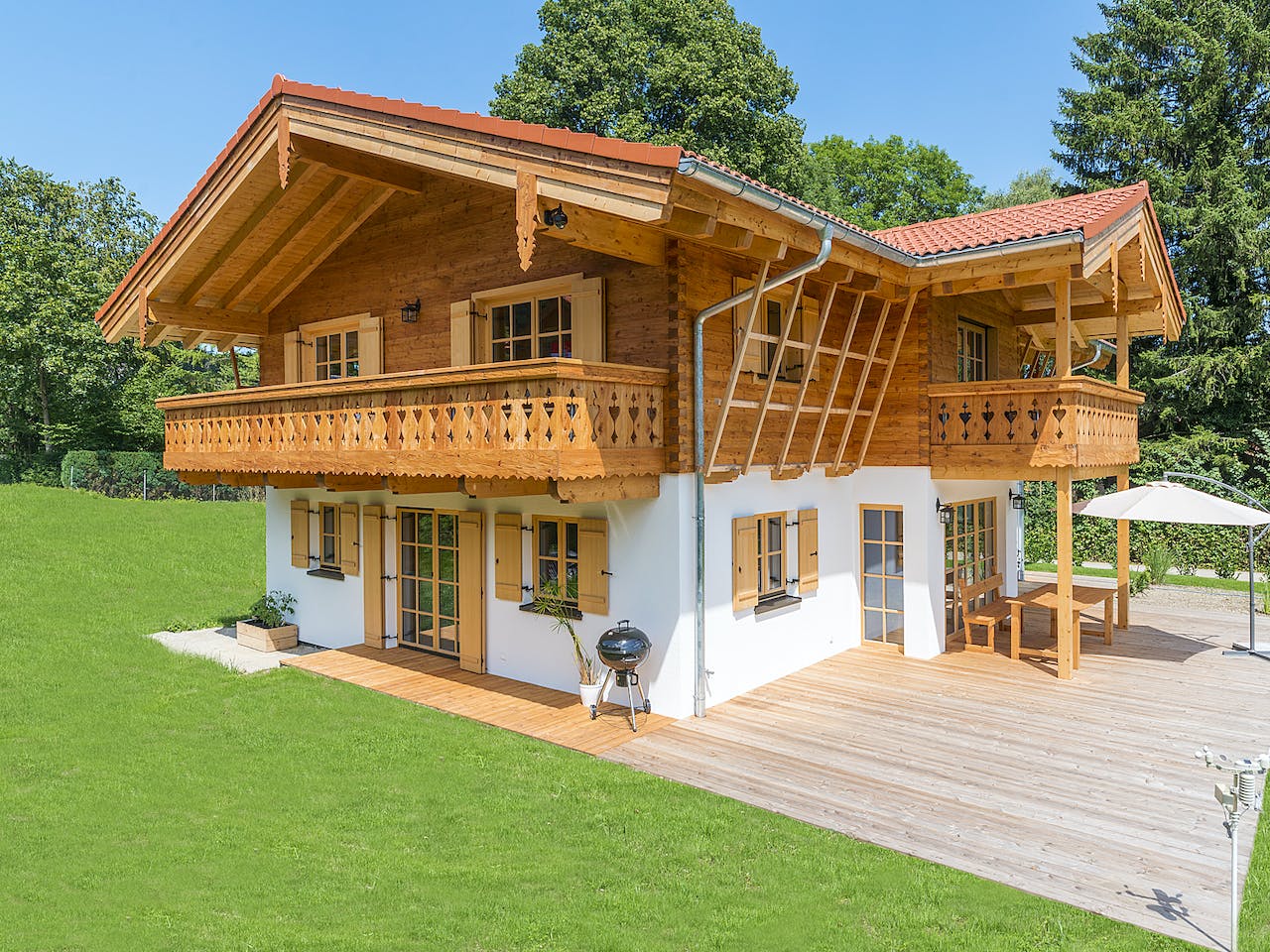 Ursprünglich wollte die Baufamilie ein Blockhaus. Da jedoch das EG verputzt sein sollte, und innen mit verschiedenen Oberflächen, von Putz bis Altholzverkleidungen verarbeitet werden sollte, fiel die Entscheidung auf unsere Holzmauer Elemente. D.h. alle Wände bestehen aus großformatigen massiven Holzelementen, außen zusätzlich mit 14 cm Holzfaserplatten isoliert. Die Oberflächen sind hier wählbar. Somit wurde im EG eine Putzoberfläche und im DG eine Blockbohlenschalung aus gebeilter Lärche mit Tiroler Schloß Ecken angebracht. Der Dachstuhl ist als Studiodachstuhl in Sichtqualität mit Aufdachdämmung aus Holzfaserplatten ausgeführt. Den Bauherren war sehr wichtig den örtlichen Baustil zu entsprechen z.B. mit großen Dachüberständen, geringe Dachneigung, Zierbalkon, usw.