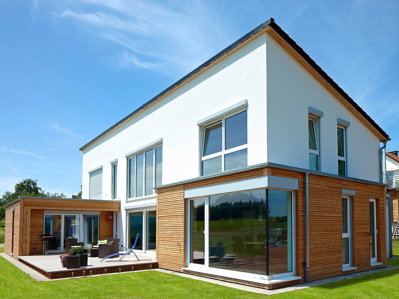 Dieses Projekt zeigt auf eindrucksvolle Weise, dass bauen mit der Holzmauer viel Freiraum in Sachen Gestaltung lässt. Der Kern: massive Holzmauerelemente. Die Fassade strahlend weiß mit mineralischem Edelputz ausgeführt. Das sichtbare Holz wird lediglich als Gestaltungselement an der Garage und an kubischen Baukörpern eingesetzt. Und innen ein lichtdurchflutetes Raumerlebnis mit allen Vorteilen, wie sie nur ein massives gebautes Holzhaus bieten kann.