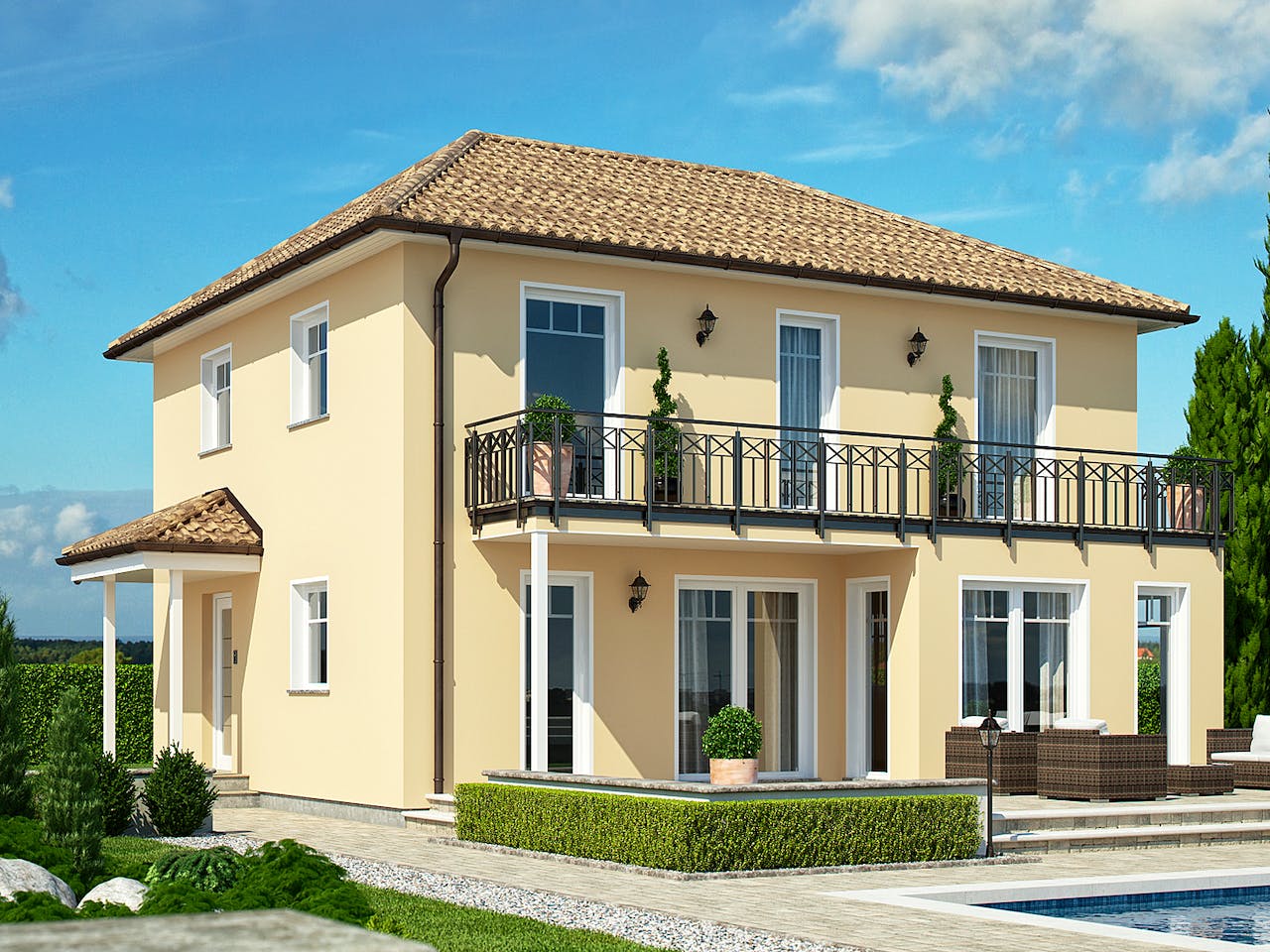 Das CLOU 135 mit Walmdach erinnert an die großzügigen Stadtvillen in den Dörfern und Städten am Mittelmeer. Küche und Essbereich werden mit dem Anbaumodul Living-Space ergänzt. Vom Wohnzimmer aus geht es direkt auf die überdachte Terrasse, die bei jedem Wetter eine Wohlfühloase ist. Zwei geräumige Kinderzimmer, Familienbad, Elternschlafzimmer mit integrierter Ankleide finden im Obergeschoss ihren Platz. Der große Balkon auf der Gartenseite ist der absolute Ehrenplatz.