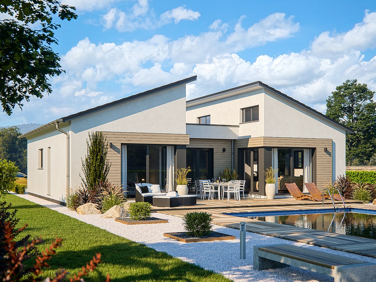 Die markante Optik wird durch die gegenüberliegenden Pultdächer erzeugt. Im dazwischenliegenden Gebäudeteil befindet sich ein Flachdach, das sowohl über den Eingangs- als auch bis in den Terrassenbereich hinausragt.