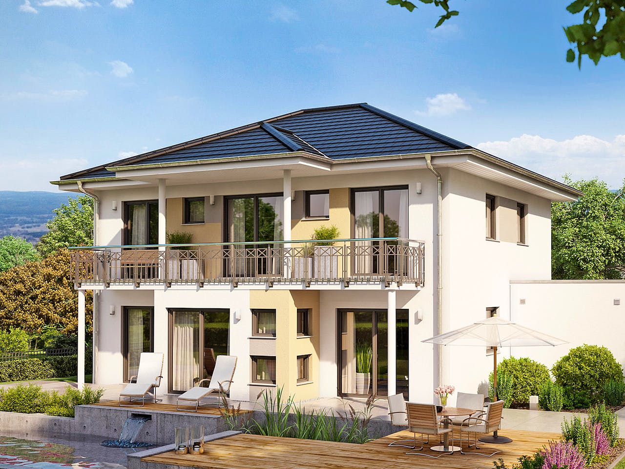 Die Stadtvilla Memphis eine moderne Variante der urbanen Wohnkultur, im Realisierungsbeispiel aufbauend auf einer Bodenplatte. Über eine offene, helle Galerie betritt man im Obergeschoss den großen, teilweise überdachten Balkon. Dachschrägen suchen Sie unterm Walmdach vergeblich, dafür können Sie mit voller Raumnutzung auf großzügig bemessenen 172 m² Wohnfläche rechnen.