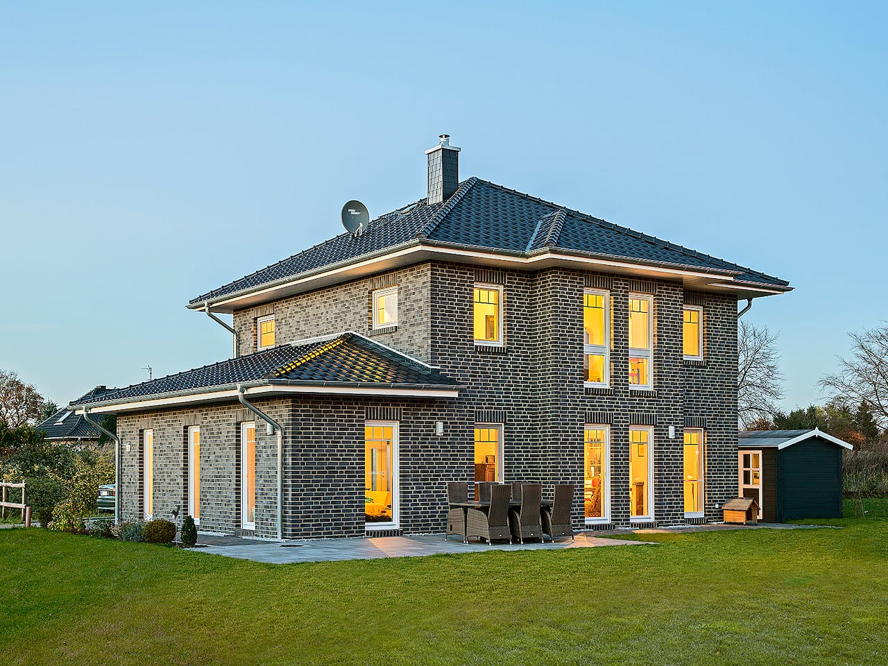 Der kubistische Baukörper mit seinen kompakten Abmessungen eignet sich besonders gut für innerstädtische Grundstücke und überzeugt mit klaren Formen sowie der großzügigen Fenstergeometrie, welche für lichtdurchflutete Räume sorgt.