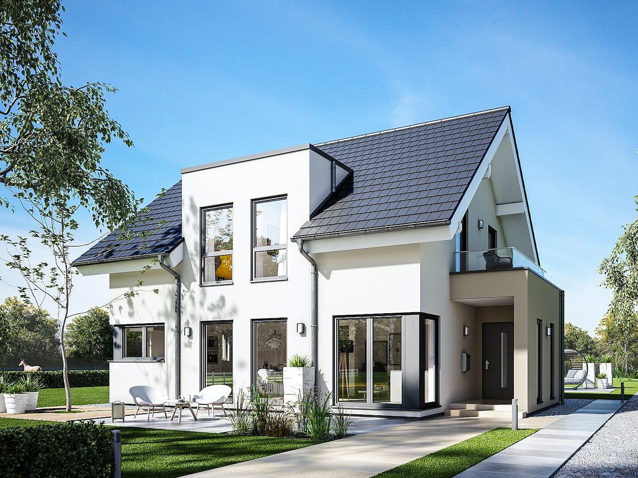 Dieses klassische Einfamilienhaus kommt mit einem Zwerchgiebel, der den Innenraum im Obergeschoss erweitert. Das Satteldach mit Dachüberstand ziert das Haus und verleiht den stylischen Anblick. Durch den zusätzlichen Windfangerker ist der Eingang geschützt und obendrauf bietet er Platz für einen Balkon mit Glasgeländer. Große Fenster lassen den rund 144 m²-großen Innenraum hell erstrahlen. Innen erwartet ein großräumiger und offener Wohn- und Essbereich, drei Schlafzimmer, zwei Bäder und ein großes Büro.