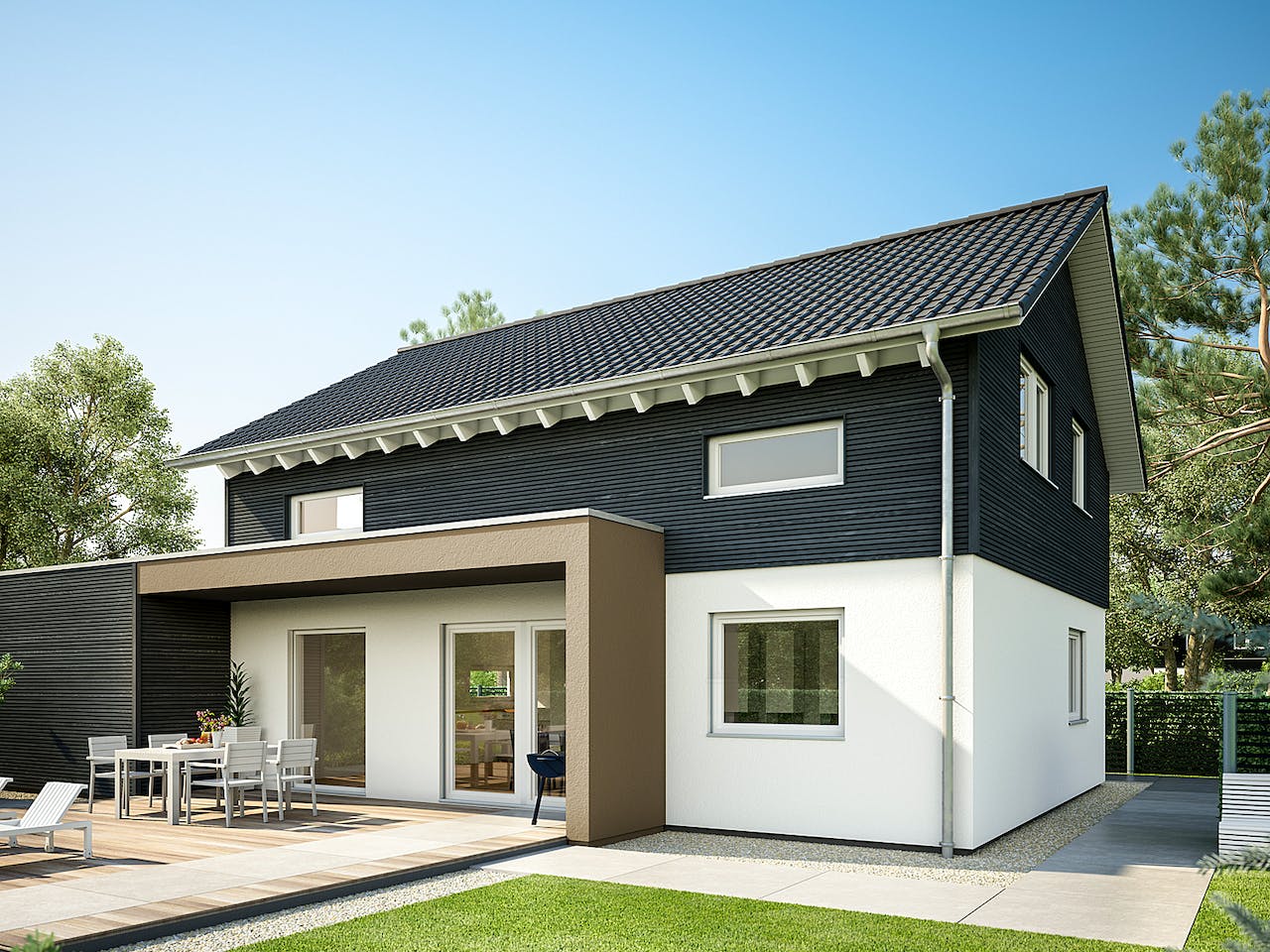 Das ist eine tolle Kombination: Helle Putzfassade und als Kontrast eine dunkle Lamellenfassade. Das Vordach an der Terrasse schützt die Fassade und im Sommer bietet es für die Bewohner ein schattiges Plätzchen vor dem Haus.