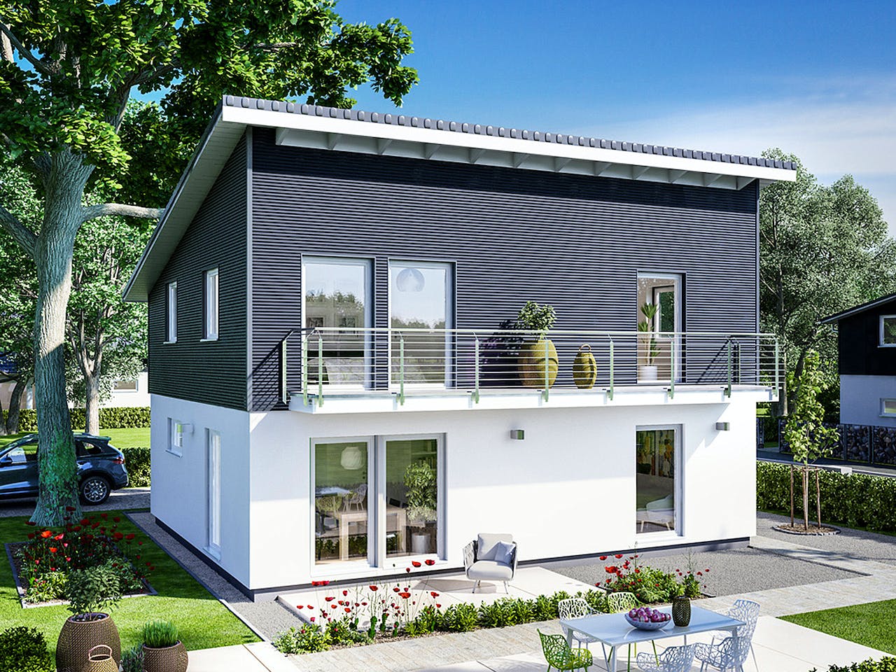 Mit einem Haus mit Pultdach liegen Sie absolut im Trend. Viele Fenster, zum Teil auch bodentief, bringen viel Licht in den offen gestalteten Wohn-/ Essbereich mit Küche. Ein separates Arbeitszimmer im Erdgeschoss bietet ausreichend Platz, um ungestört der Büroarbeit nachgehen zu können. Im Dachgeschoss können Sie die Morgensonne auf dem großzügigen Balkon genießen.