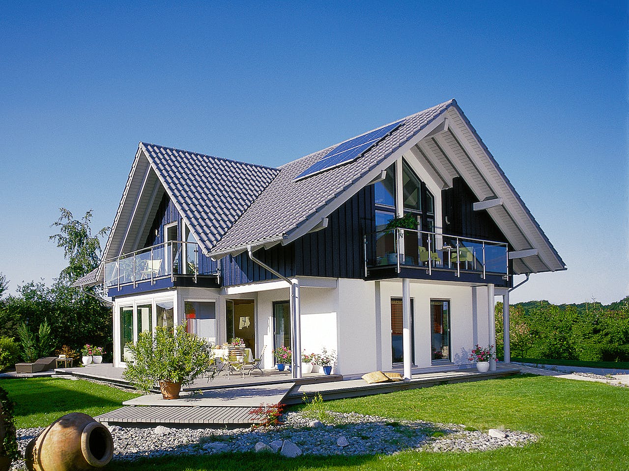 Sicherheit, Geborgenheit und Komfort finden viel Platz in diesem großzügigen Einfamilienhaus. Mit Wintergarten Erker und drittem Giebel wird das Wohnen repräsentativ und lichtdurchflutet. Dieses Haus repräsentiert die moderne Architektur des Landhausstils nicht zuletzt durch die Kombination aus weißer Putz- und blauer Holzfassade. Der Wintergarten Erker ermöglicht im Dachgeschoss einen Balkon. Hierbei stellt sich nur noch die Frage: Soll die Sonne im Wintergarten oder auf dem Balkon genossen werden?