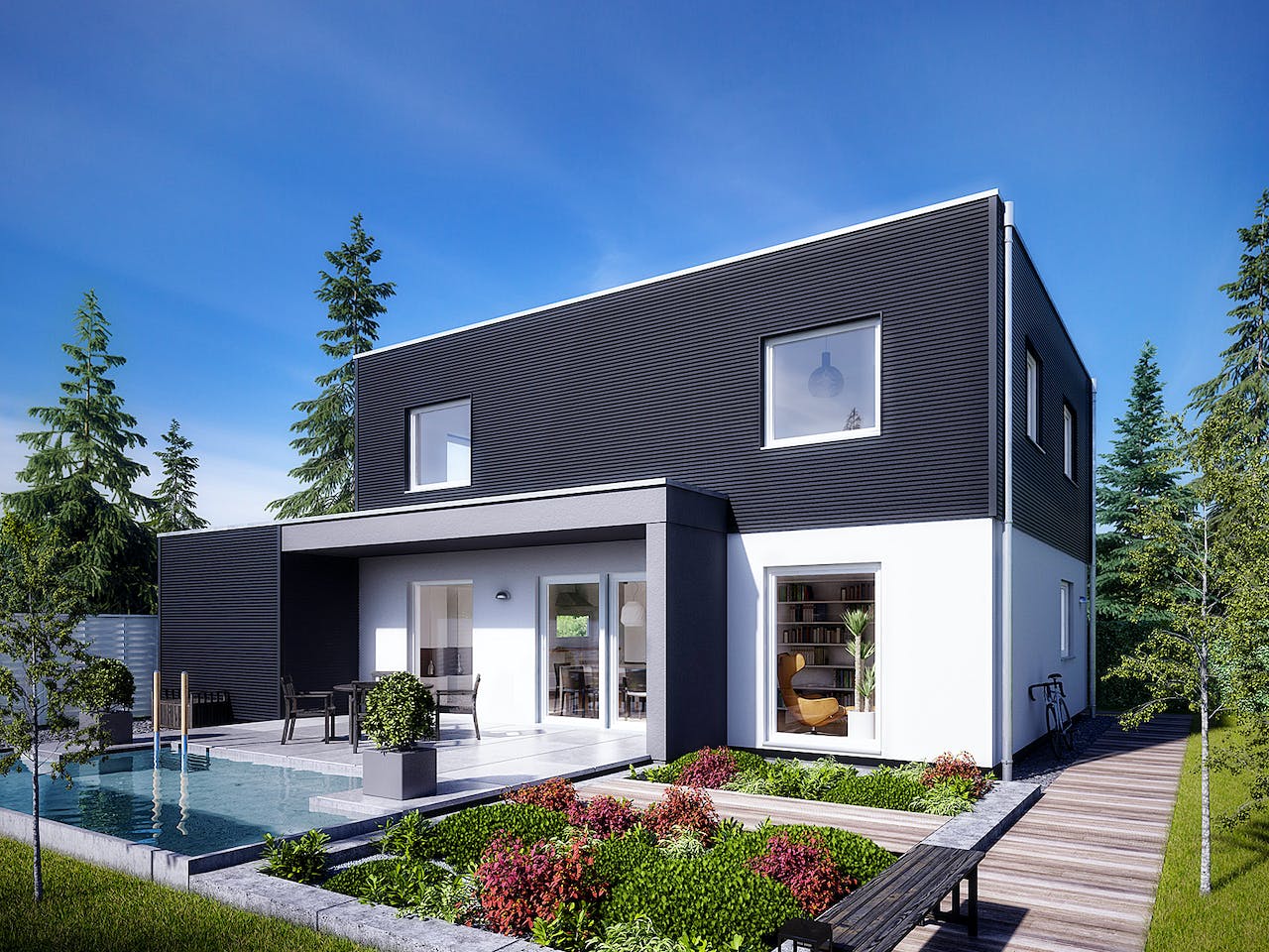 Schlichte und geradlinige Architektur, sowie ein Flachdach, sind klassische Merkmaler eines modernen Bauhausstils. Mit zweigeschossiger Bauweise und Flachdach liegen Sie nicht nur voll im Trend, Sie erhöhen auch Ihr Raumangebot. Die Holz- und Putzfassade können Sie nach belieben kombinieren, dazu gehört auch die Auswahl der Farbe.