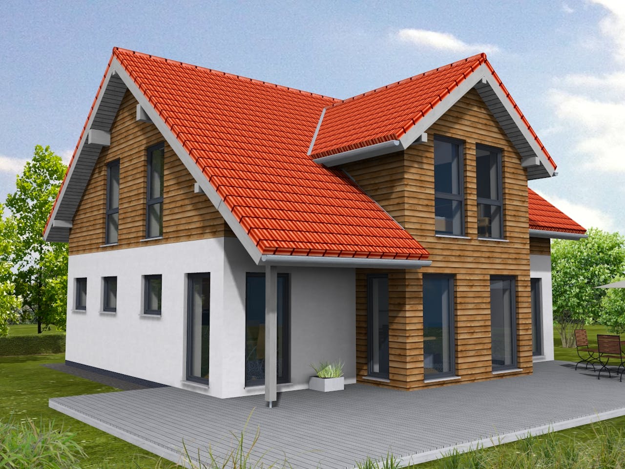 Ein Klassiker im modernen Landhausstil, so präsentiert sich das Ambiente 156. Die hochwertige, wetterbeständige Holzverschalung ist ein Qualitätsmerkmal und stellt eine optische Verbindung zur Natur dar.