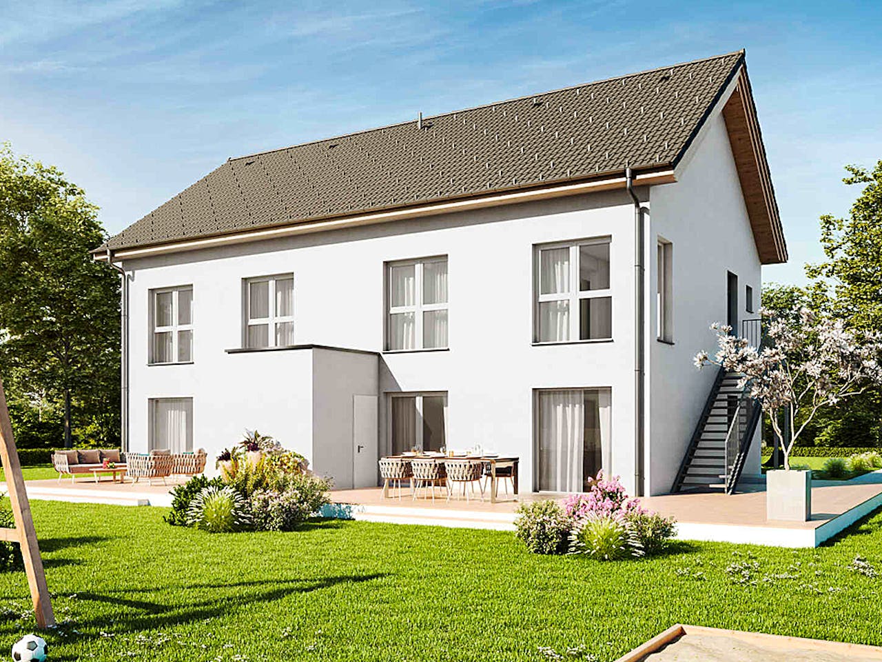 Die angegebenen Flächen sowie Preise für die unterschiedlichen Ausbaustufen beziehen sich jeweils auf die linke Doppelhaushälfte. Das gesamte zu errichtende Doppelhaus besteht aus drei Wohneinheiten - eine Doppelhaushälfte mit einer Wohneinheit + eine Doppelhaushälfte mit zwei Wohneinheiten. Daher werden sowohl die Flächen als auch die Preise entsprechend addiert.