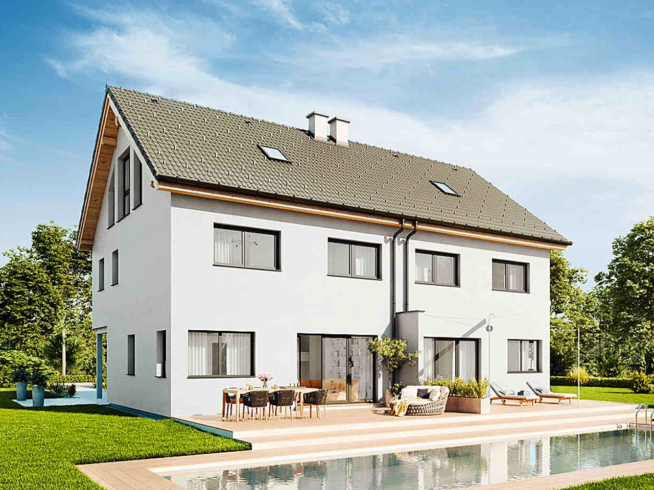 Das Doppelhaus Duplex D113 XL beweist mit großzügigen 170m² Bodenfläche auf drei Ebenen, dass eine offene Raumplanung und durchdachtes Wohnen für die ganze Familie kein Widerspruch sind. Praktisch präsentiert sich bereits der überdachte Eingang, wo man wetterunabhängig Einkäufe, Schuhe oder Fahrräder abstellen kann. Praktisch auch im Obergeschoß zwei direkt nebeneinander liegende, knapp 15m² große Zimmer, die sich ganz einfach zu einem großen Raum zusammenfügen lassen. Und unter dem Satteldach präsentiert sich ein heller 58m² großer Raum als familiäres Multitalent. Atelier oder Bürofläche, Indoor-Spielplatz oder Hobbyraum – hier hat man die Qual der Wahl. Dieses Haus gibt es auch als kleinere Variante ohne ausgebautem Dachgeschoß Duplex D113 S.