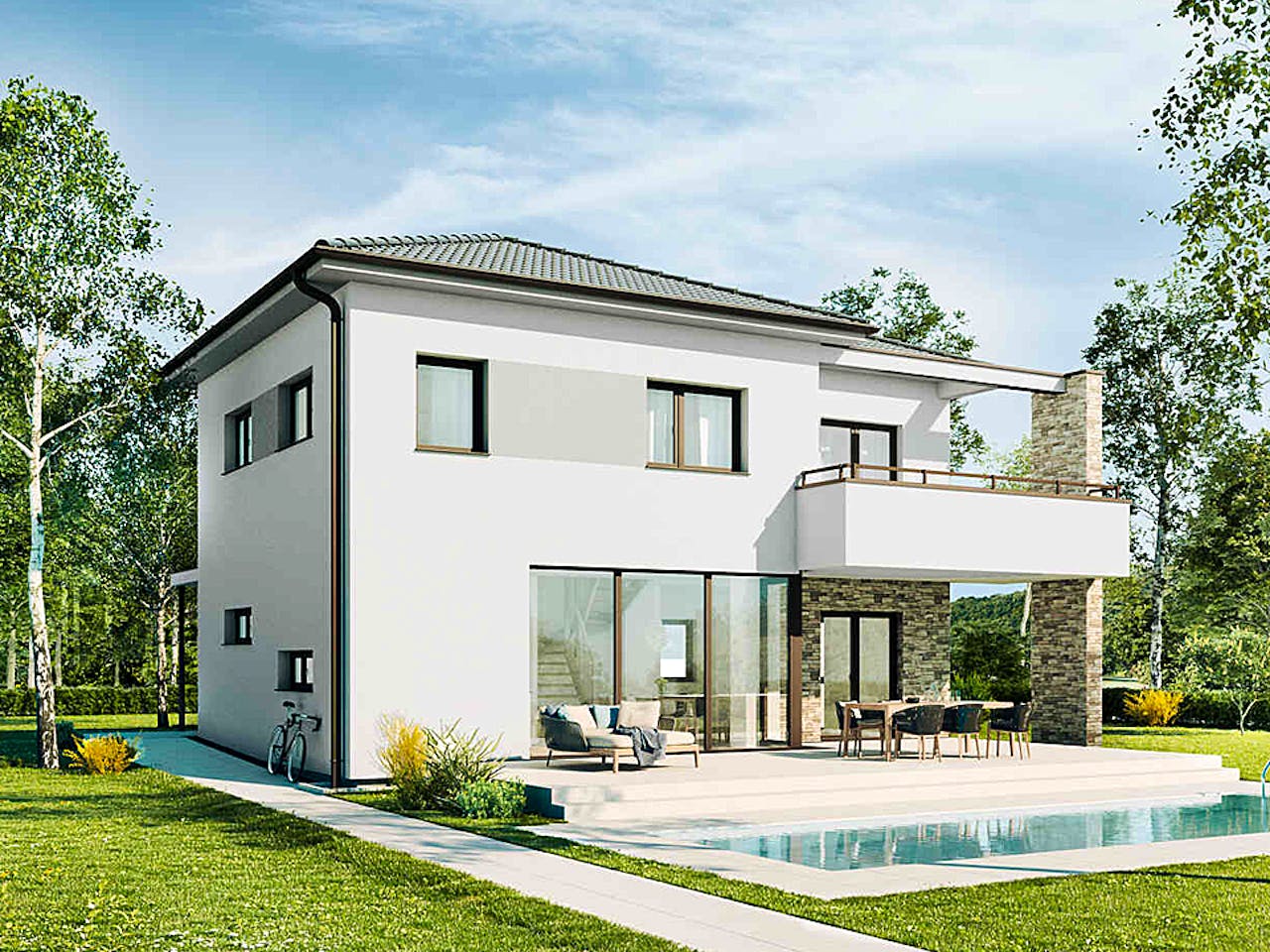 Falls Sie etwas ganz Besonderes suchen, könnte unser New Design Esprit genau das Richtige für Sie sein. Zwei leicht versetzte Baukörper schaffen auf knapp 153m² eine Formensprache die Ihren Geschmack treffen wird. Die offene Stiege im Wohnzimmer verbindet Wohnen – Essen – Kochen harmonisch zusammen. Die südseitige Fensterfront mit den großen Glasflächen und Terrassentüren schaffen eine einzigartige Wohlfühlatmosphäre. Im Erdgeschoß haben Sie noch ein Extrazimmer sowie eine Dusche und ein WC zur Verfügung. Der optionale Balkon schafft auch im Erdgeschoß eine geschützte Nische auf der Terrasse. Im Obergeschoß bleiben mit Elterntrakt und zwei Kinderzimmern mit Kinder-Bad keine Wünsche offen.