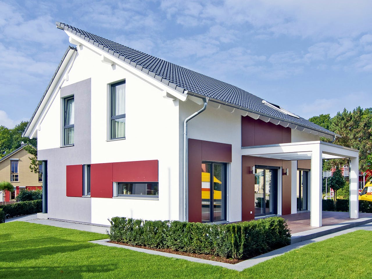 Unter dem versetzten Pultdach dieses schicken Musterhauses in Bad Vilbel verbergen sich zwei geräumige Geschosse mit156 Quadratmeter Wohnfläche. Eine großzügige und clevere Raumaufteilung lässt pures Wohnvergnügen aufkommen – hier ist genügend Platz für eine mehrköpfige Familie oder ein freiheitsliebendes Paar. Auch von außen macht das Haus eine gute Figur: Dezente Grautöne und ein Bordeaux-Rot sorgen an der sonst weißen Fassade für farbige Akzente.