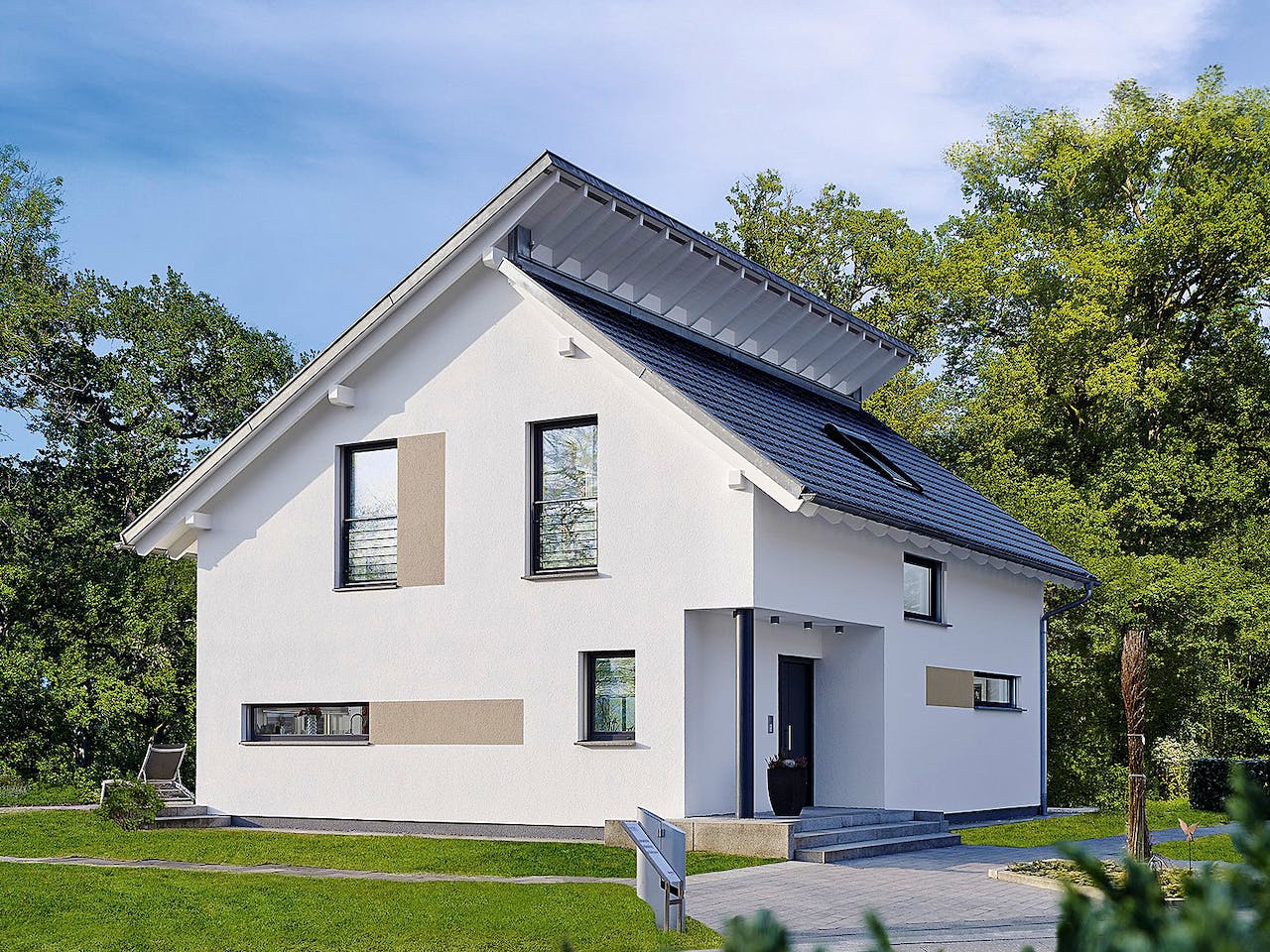Ausbaustufe Malerfertig, inkl. Bodenplatte, mit Satteldach, ohne Terrassenüberdachung, Hausabbildung zeigt aufpreispflichtige Extras, Stand 10/2025