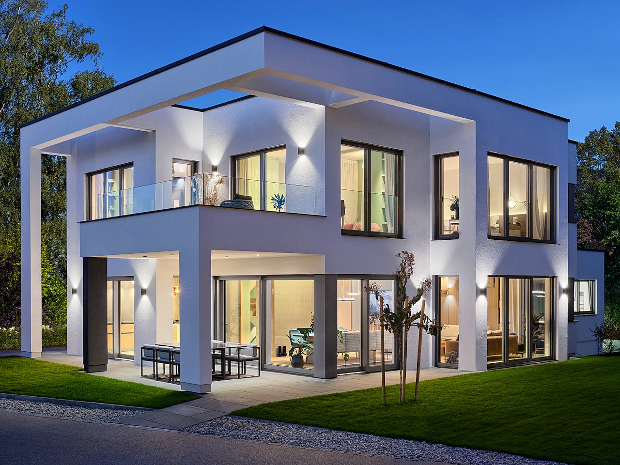 Die Basis dieser modernen Villa ist ein klarer, weißer Kubus, der durch auskragende Elemente akzentuiert wird. Für viel Transparenz sorgen großzügige Glasflächen. Die offene Struktur lässt die Grenzen zwischen Innen und Außen verschwimmen. Balkone und Terrassen laden zum Entspannen ein.