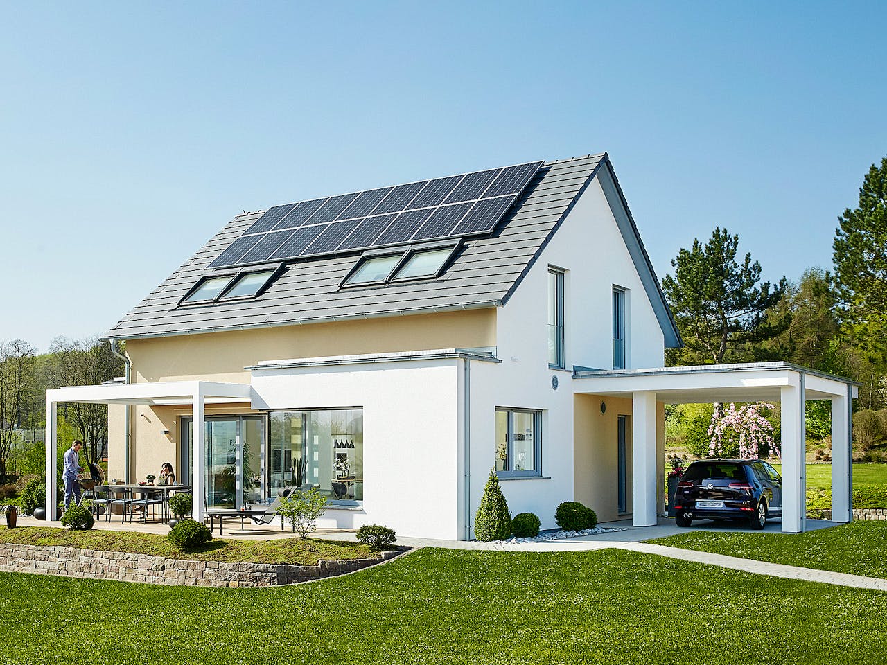 Das rund 140 Quadratmeter große Einfamilienhaus mit Satteldach in moderner Dachausführung verfügt über anderthalb Geschosse und überzeugt durch sein raffiniertes Raumkonzept. Durch intensive Planung entstand ein Entwurf mit großzügigem Platzangebot auf kompakter Fläche und dennoch muss der zukünftige Hausbesitzer auf nichts verzichten. Wohlfühlplätze, wie eine Fenstersitzbank oder eine Terrasse mit hochwertiger Pergola, und clevere Details, wie eine integrierte Garderobe oder ein zusätzliches Zimmer im Erdgeschoss, runden das Eigenheim ab.