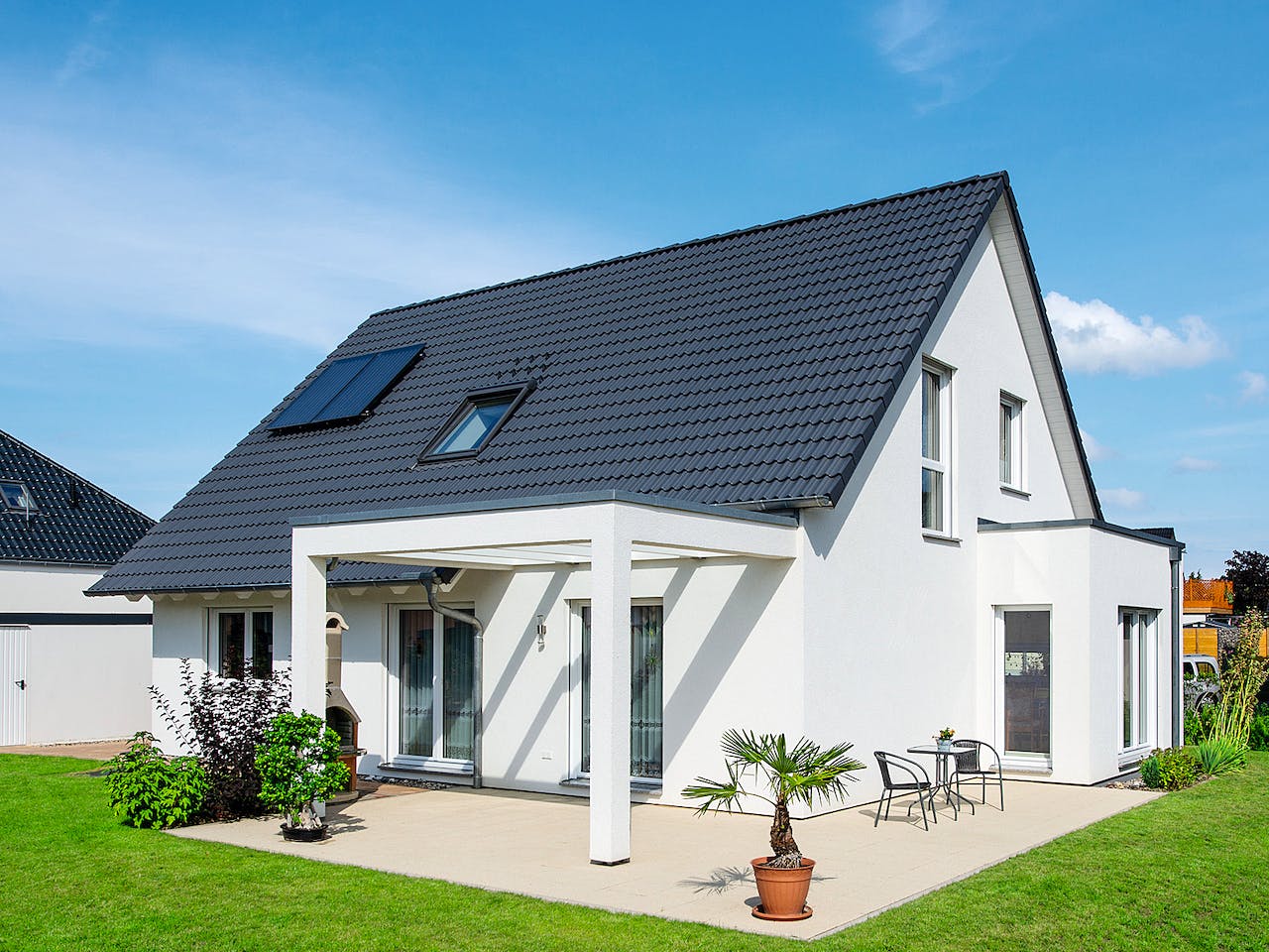 Mit dem Auszug der Kinder beschloss das Ehepaar Herse, ihr Haus zu verkaufen und nach den neuen Bedürfnissen ein zweites Mal zu bauen. Entstanden ist ein klassisches Wohnhaus aus der Baureihe Balance. Das Satteldach ohne Kniestock ist mit schiefergrauen Betondachsteinen eingedeckt. In Kombination mit der weißen Putzfassade und den Fensterrahmen in Weiß kommt das anderthalb-geschossige Haus schlicht und zurückhaltend daher. Dank dem Rechteckerker auf der Südseite ist die Küche noch geräumiger. Vom Ess- und Wohnbereich gelangt man auf die Terrasse. Eine Pergola mit Dachverglasung schützt vor Regen.