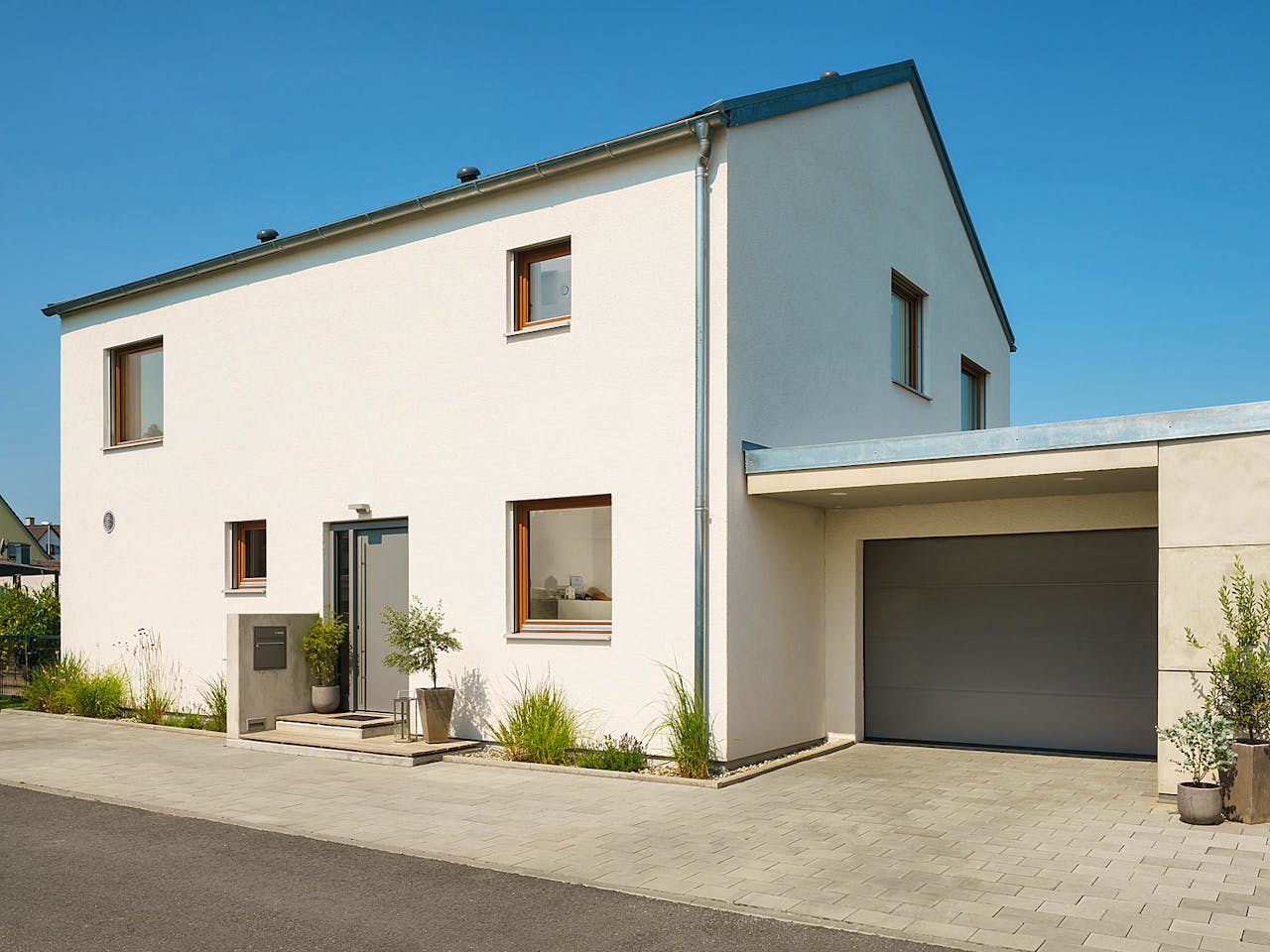 Dieses Einfamilienhaus wirkt schlicht und modern. Das liegt vor allem an der hellen Fassade in Kombination mit dem Satteldach ohne Dachüberstand. Die Fensterrahmen sind aus Holz gefertigt und verleihen dem Neubau ein freundliches Erscheinungsbild. Das anderthalb-geschossige Haus verfügt über einen hohen Kniestock, so stehen der Familie im Dachgeschoss mehr vollwertige Quadratmeter zur Verfügung. Auf der Hausrückseite befinden sich zwei große Fensterfronten mit Zugang nach draußen.