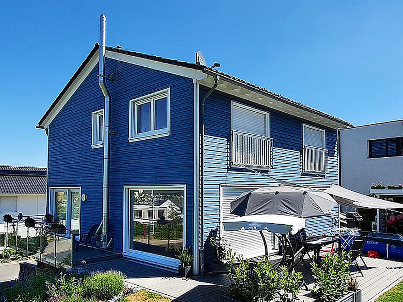 Dieses charmante Einfamilienhaus ist ein absoluter Hingucker, der mit seinem Anblick zum Träumen verleitet und Fernweh weckt. Der Kontrast zwischen friesenblauer Holzfassade und strahlend weißen Fenstern erinnert an skandinavische Architektur und Schwedenhäuser.
