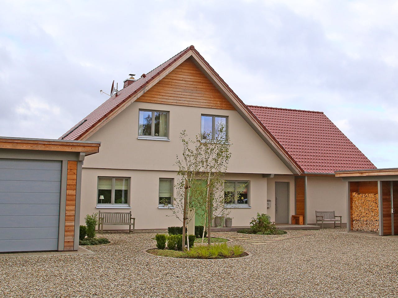 Das Landhaus in wohngesunder Holzrahmenbauweise besticht durch ein offenes Wohnkonzept mit Kamin. Durchflutet von Tageslicht, strahlt es Wärme aus und schafft ein freundliches Raumgefühl. Die überdachte Terrasse ist als Lounge gestaltet und lädt bei jedem Wetter zum Verweilen ein.