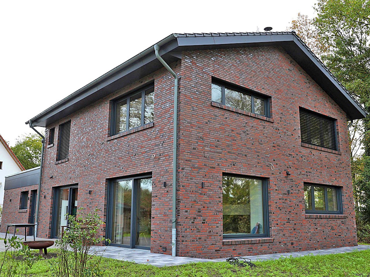 Dieses energieautarke Massivholzhaus mit ortsüblicher Klinkerfassade verbindet nachhaltige Architektur mit modernem Komfort. Das offene Raumkonzept und die bodentiefen Eichenfenster fluten die Räume mit Licht. Der Kaminofen, Holzdielen und Lehmputz schaffen eine gemütliche Atmosphäre. Das großzügige Bad mit Sauna bietet perfekten Raum zum Entspannen. Ein Zuhause für höchste Ansprüche.